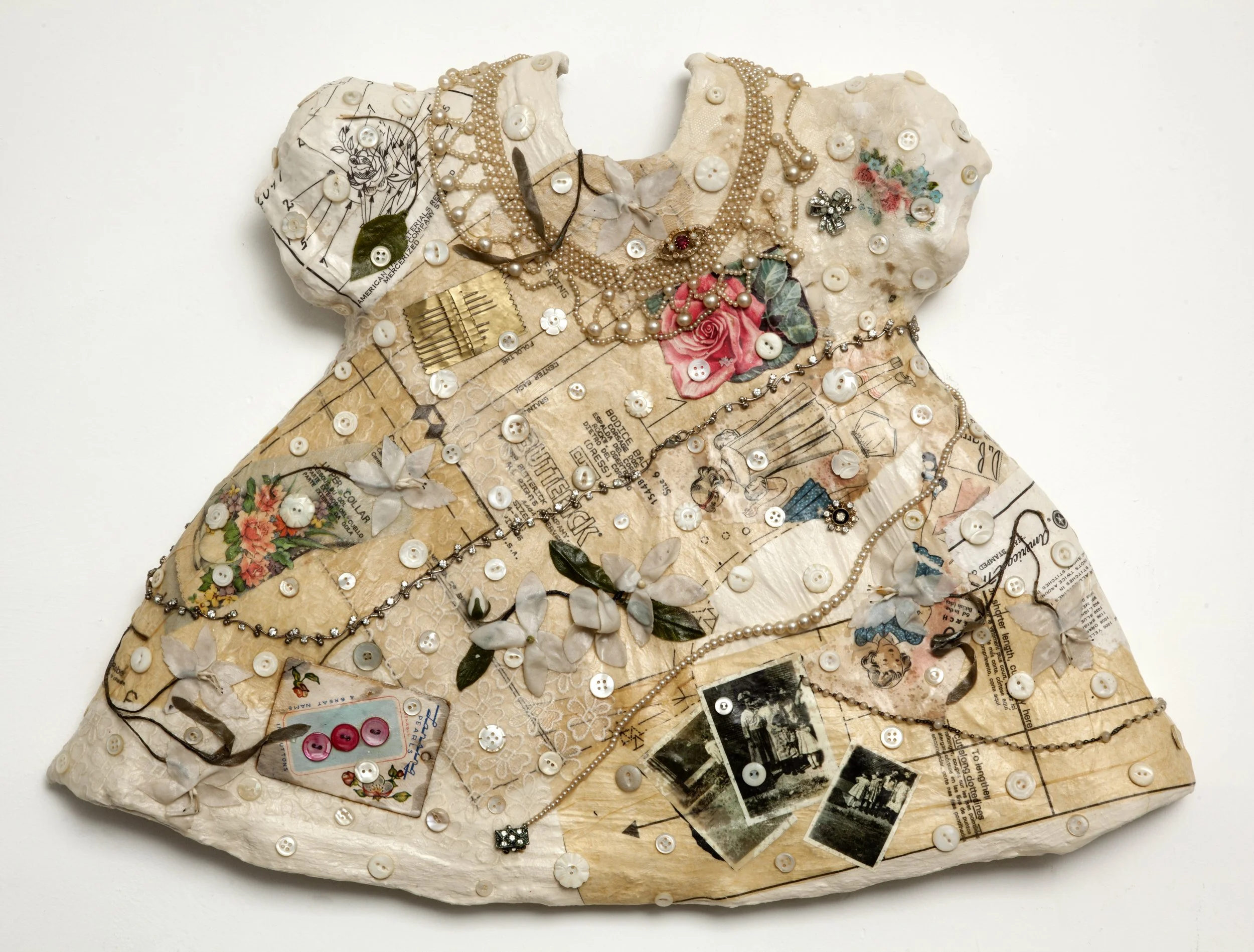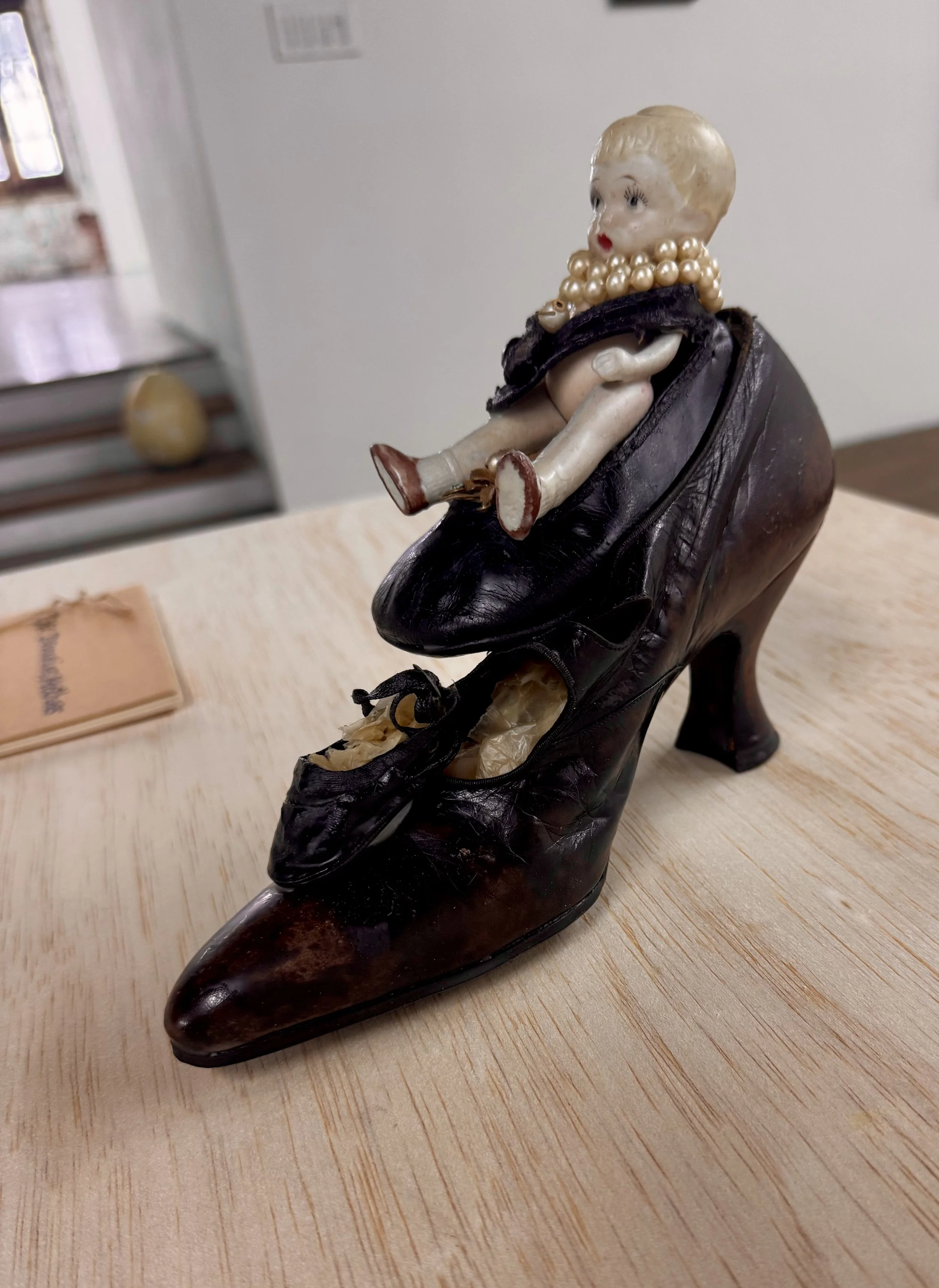 Shoe Stack, 2025, antique shoes, porcelain doll, dress pattern paper, costume jewelry, encaustic, 7.5 x 9.5 x 3.5 inches