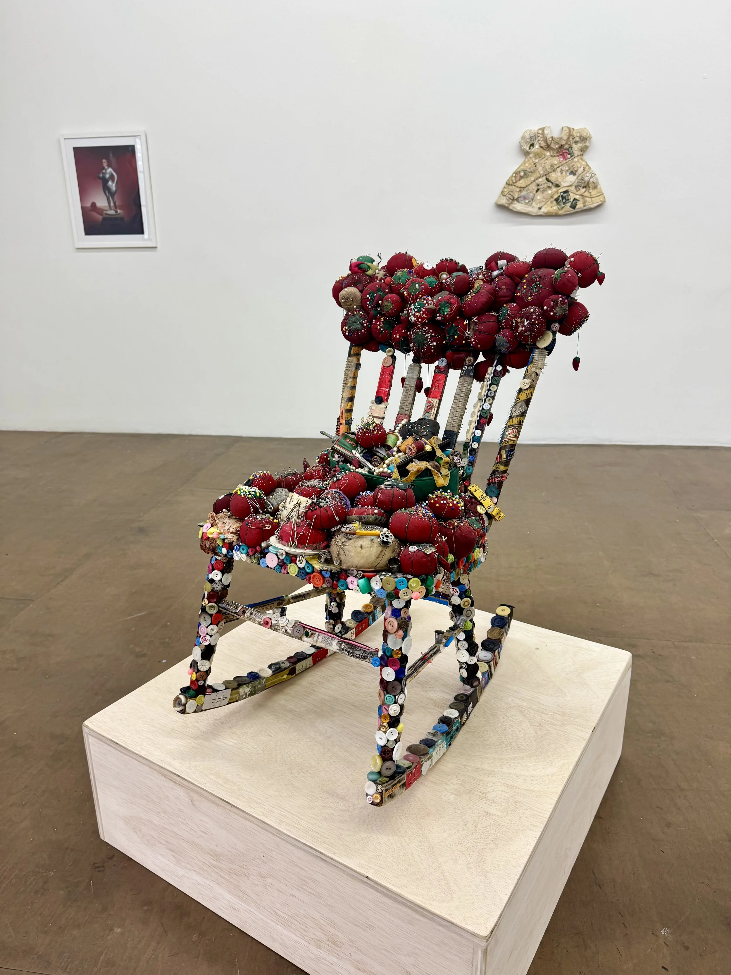 Sewing Chair, 2023, Wood chair, pin cushions, sewing box, sewing notions, buttons, acrylic glue, encaustic, 33.5 x 23.5 x 27 inches